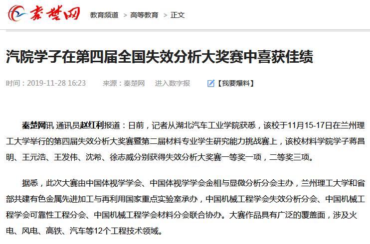 【秦楚网】汽院学子在第四届全国失效分析大奖赛中喜获佳绩