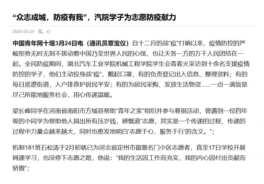 【中国青年网】“众志成城,防疫有我”,汽院学子为志愿防疫献力