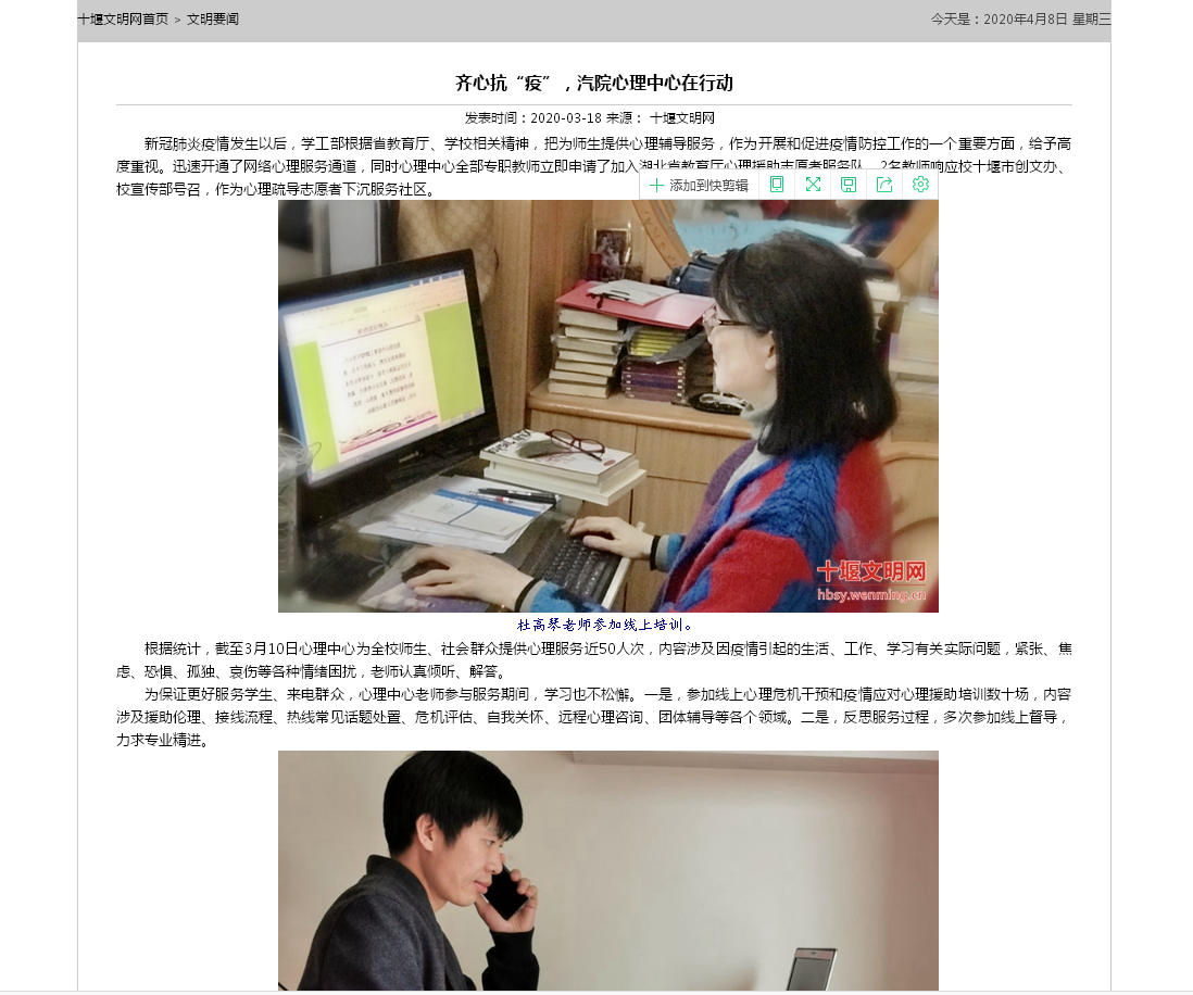 【十堰文明网】齐心抗“疫”,汽院心理中心在行动