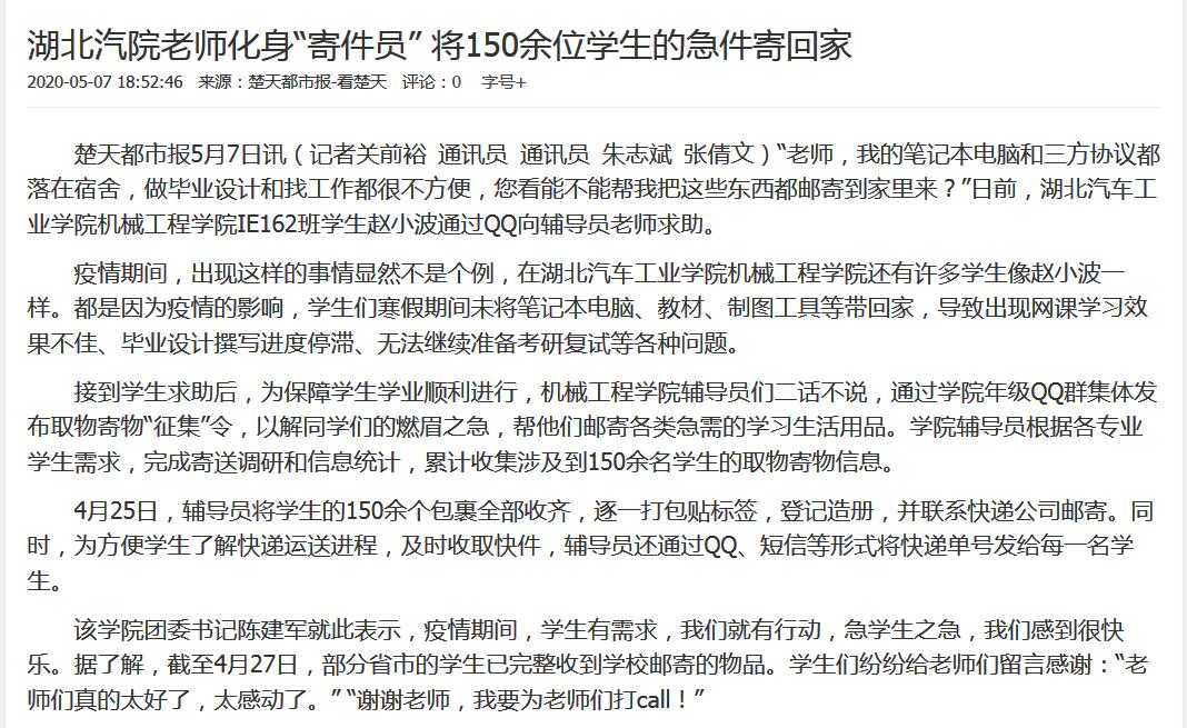 【楚天都市报】湖北汽院老师化身“寄件员” 将150余位学生的急件寄回家