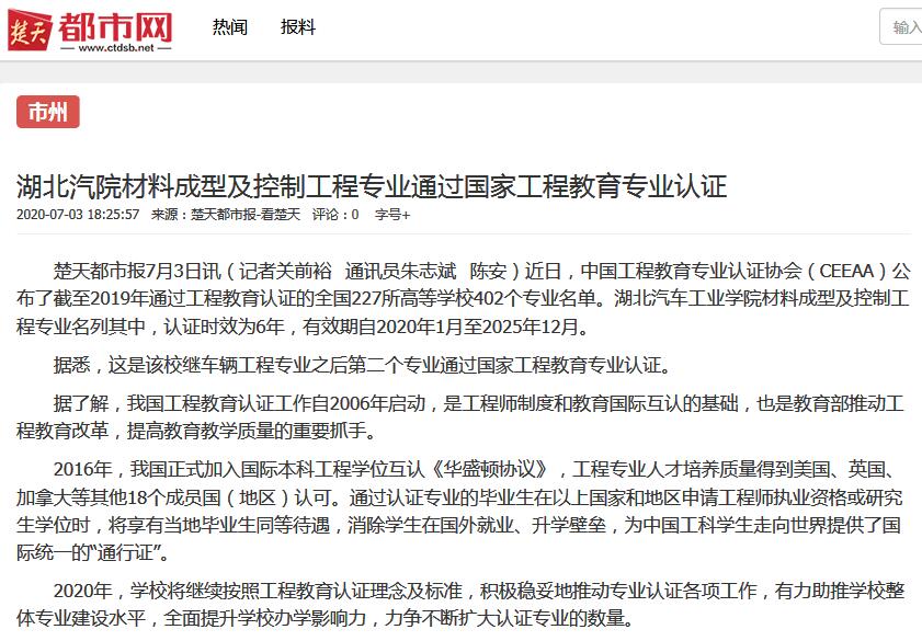 【楚天都市报】湖北汽院材料成型及控制工程专业通过国家工程教育专业认证