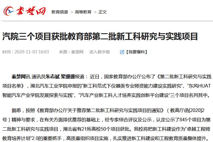 【秦楚网】汽院三个项目获批教育部第二批新工科研究与实践项目