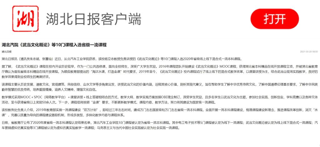 【湖北日报】湖北汽院《武当文化概论》等10门课程入选省级一流课程