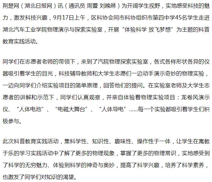 【荆楚网】十堰市张湾区组织学生走进湖北汽院物理实验室
