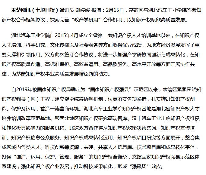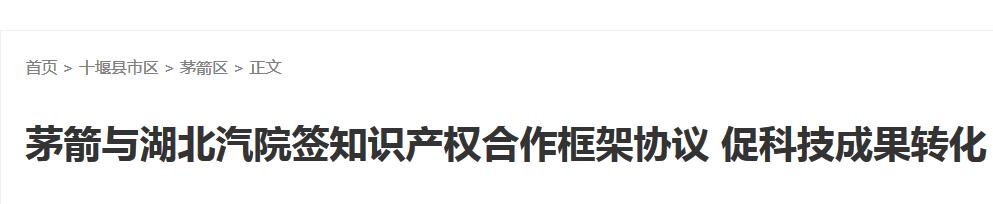 【秦楚网】茅箭与湖北汽院签知识产权合作框架协议 促科技成果转化