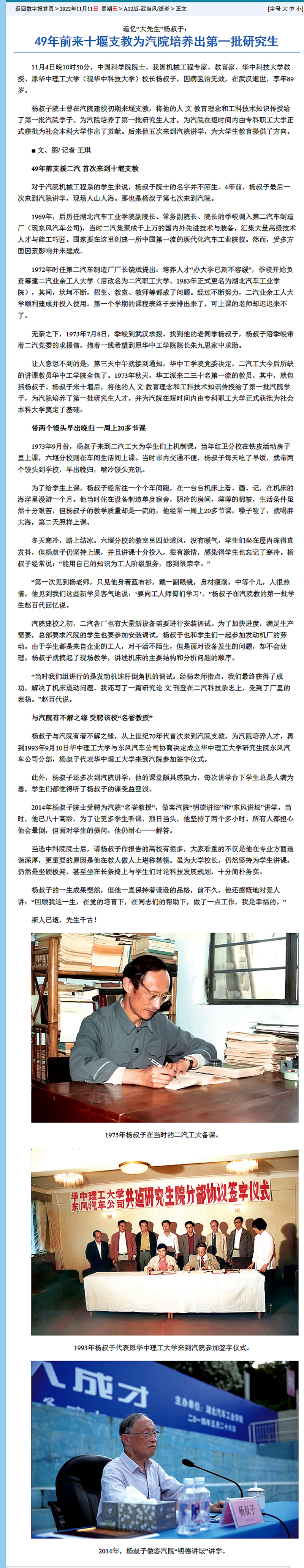 【十堰晚报】追忆“大先生”杨叔子:49年前来十堰支教为汽院培养出第一批研究生