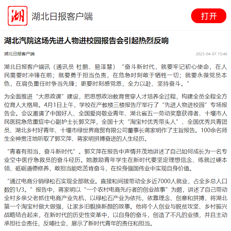 【湖北日报】湖北汽院这场先进人物进校园报告会引起热烈反响