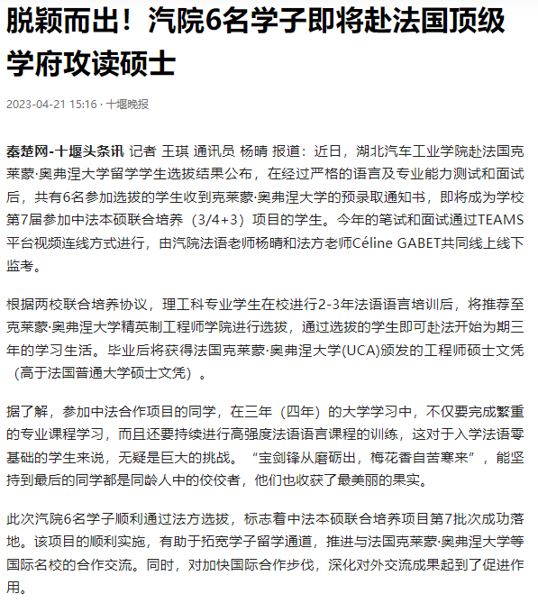 【秦楚网】脱颖而出!汽院6名学子即将赴法国顶级学府攻读硕士
