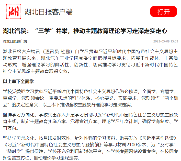 【湖北日报】湖北汽院:“三学”并举,推动主题教育理论学习走深走实走心