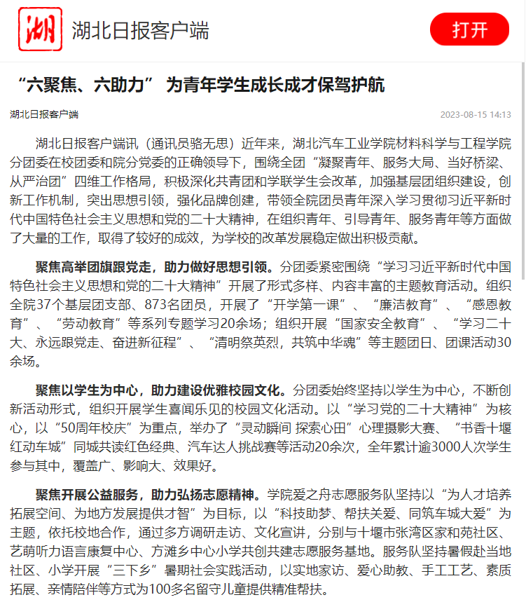 【湖北日报】“六聚焦、六助力” 为青年学生成长成才保驾护航