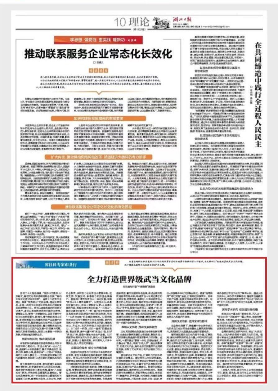 10月10日,湖北日报理论版刊发我校党委副书记李涛教授和马克思主义学院院长黄永昌教授的调研文章《全力打造世界级武当文化品牌》。