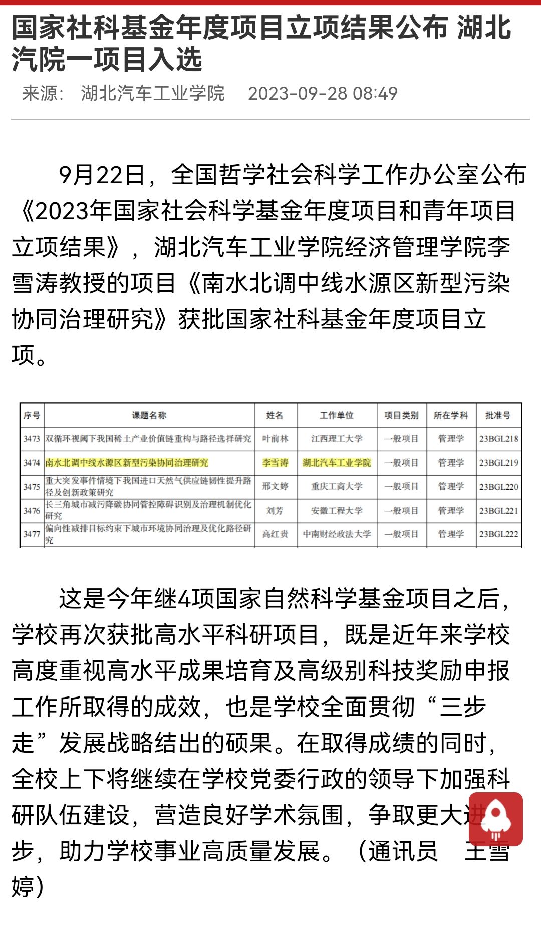 【秦楚网】国家社科基金年度项目立项结果公布 湖北汽院一项目入选