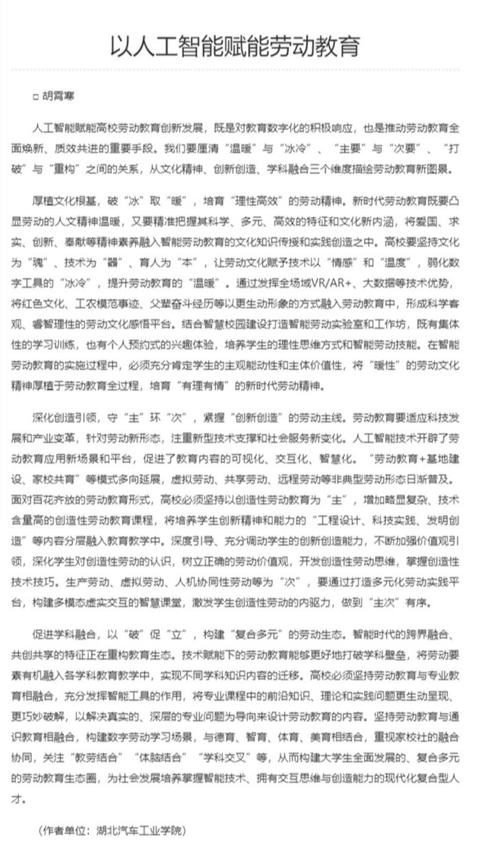 【湖北日报】湖北日报理论版刊发我校辅导员理论文章《以人工智能赋能劳动教育》